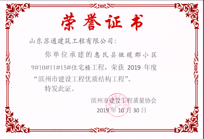 山東蘇通建筑工程有限公司,創(chuàng)建于2009年8月。目前擁有房屋建筑工程施工總承包壹級、市政公用工程施工總承包叁級、水利水電工程施工總承包叁級資質,同時還具有建筑裝修裝飾工程專業(yè)承包貳級、消防設施工程專業(yè)承包貳級、鋼結構工程專業(yè)承包叁級、建筑機電安裝工程專業(yè)承包叁級等專業(yè)承包資質。 公司總部坐落于山東省濱州市濱城區(qū)黃河十二路877號,現(xiàn)有辦公面積約2000平方米,機構設黨支部工會辦公室、總經理辦公室、綜合辦公室、工程管理部、經營預算部、資產財務部、材料設備部、運行管理部、法律事務部等多個職能部門。公司管理體系已經通過了GB/T 19001及GB/T 50430質量管理體系、GB/T 24001環(huán)境管理體系(EMS)、GB/T 28001職業(yè)健康安全管理體系(OHSMS)等體系的認證。 公司承建完工了濱州市建大教師之家、建大清怡苑、香格里拉水岸綠城住宅小區(qū)、雙泰建大城、曲阜崇德公館住宅小區(qū)、北海新區(qū)御景藍灣住宅小區(qū)、沾化德榮國際華城住宅小區(qū)、惠民橄欖郡住宅小區(qū)等工程項目,目前在建工程項目有:濱州市頤高國際電子商務產業(yè)園住宅小區(qū)項目、濱州市東盛國際項目、高新區(qū)建大中央華府住宅小區(qū)項目、濱州市融匯新里程住宅小區(qū)項目、濱州市建大秦皇壹號住宅小區(qū)項目、濱州市森林花...
